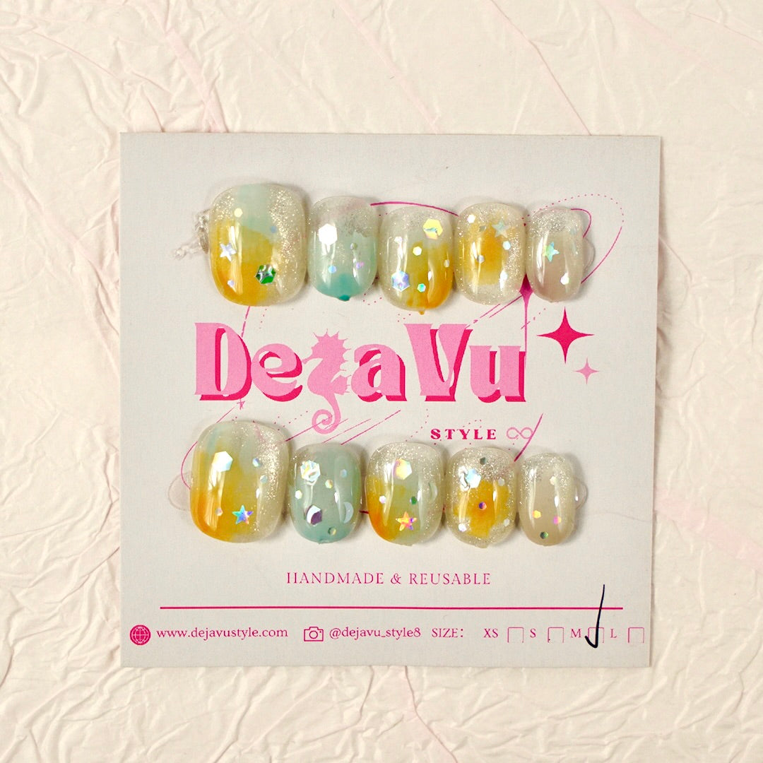 Featuring a refreshing yellow and mint green ombré base with shimmering glitter and holographic star accents, these press-on nails offer a dreamy, fun aesthetic perfect for summer days or festivals.